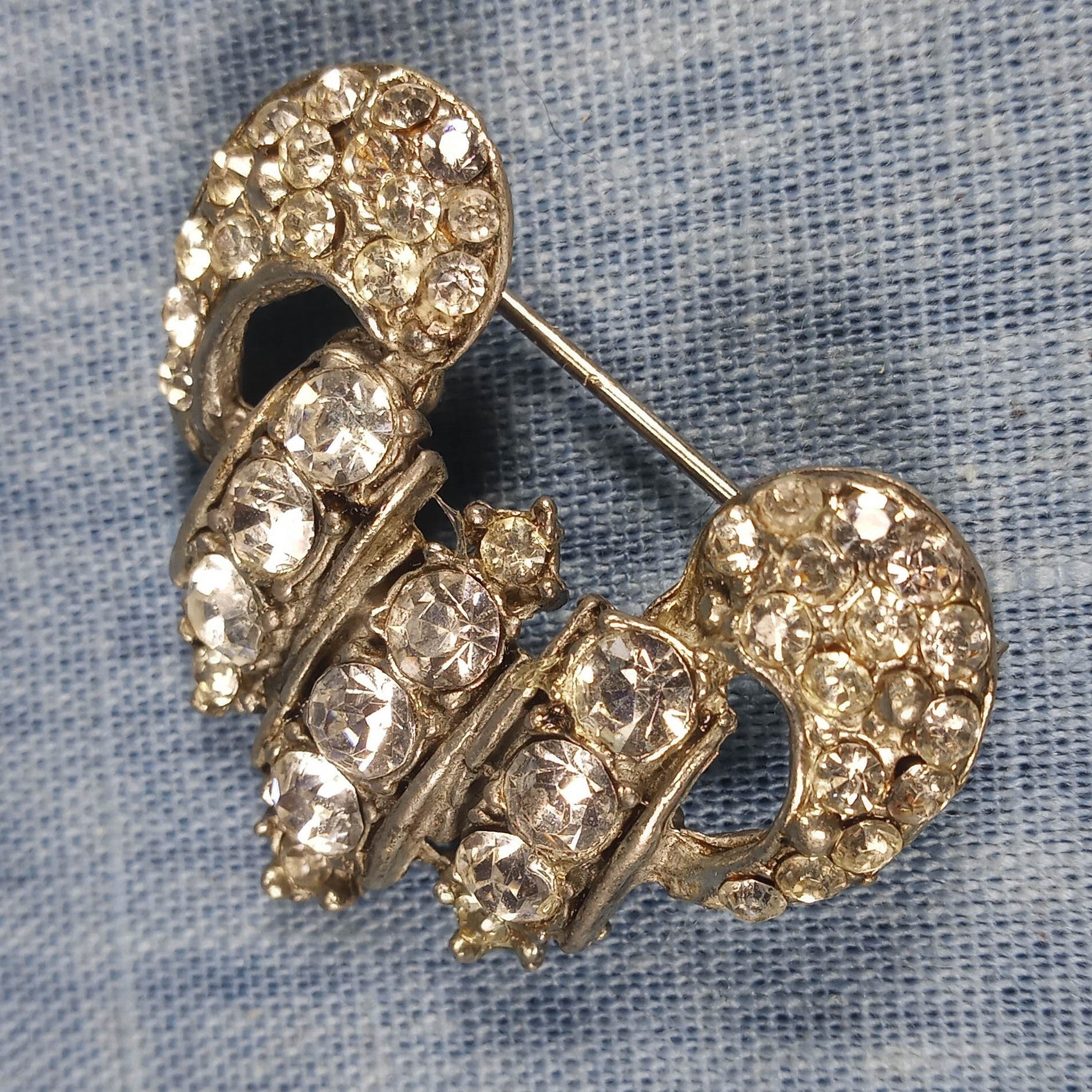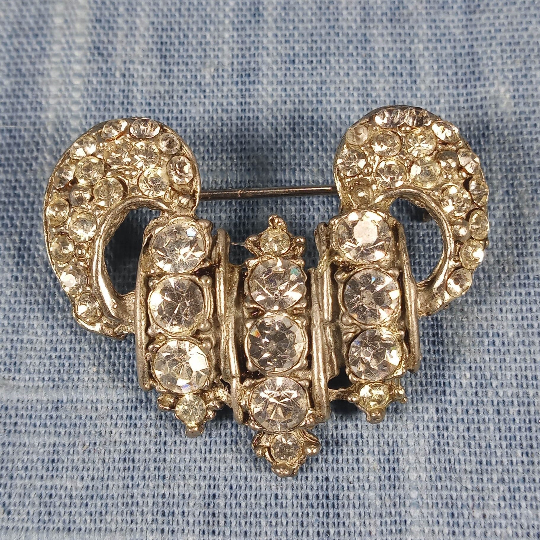 Add a sparkle of history to your look with this playful 1930s vintage crest pin. Adorned with clear rhinestones, it effortlessly blends timeless charm with eye-catching shine. Perfect for anyone who loves a touch of vintage whimsy!