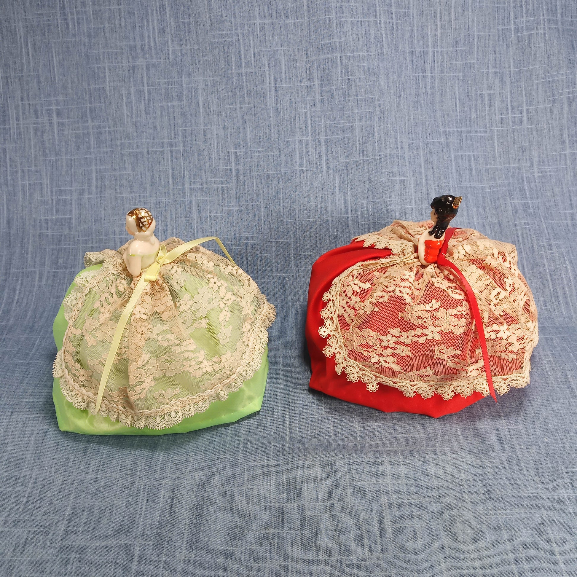 1940s Two Vintage Porcelain Figurine Pincushions: Hand Painted with Lace
