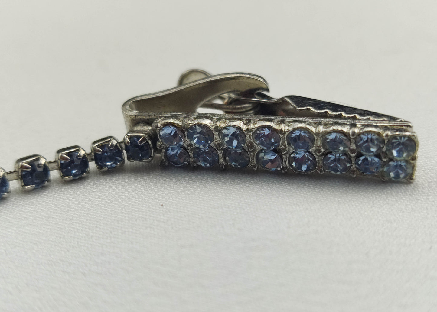 Baby blue rhinestone chain and encrusted on clips makes this rare sweater clip from the 1950's shine!