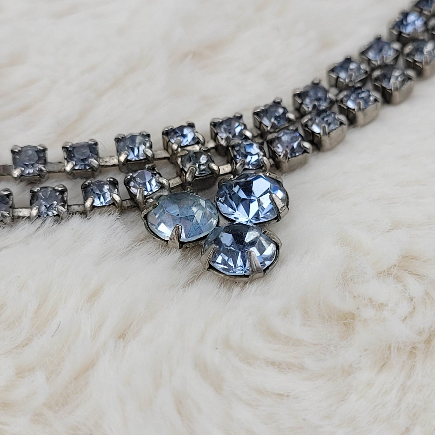 Stunning necklace to accompany a LBD or other semi-formal outfit. Sparkling light blue rhinestones that transition from a single row to a double row and finally to three larger drop rhinestones. Signed Royal.