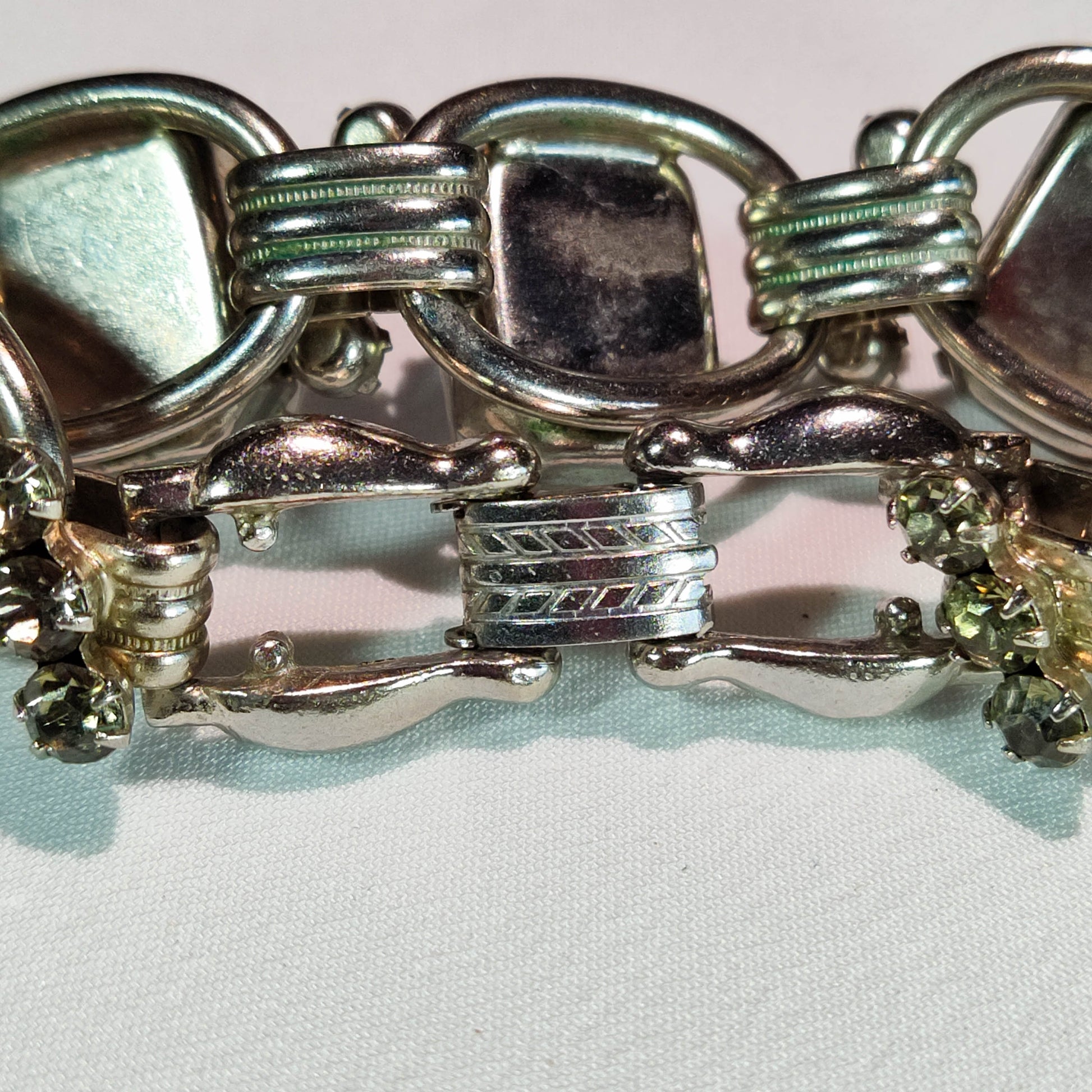 Interlocking silver tone metal 1950's bracelet with large white moonstones alternating with sets of three gray rhinestones. Secures with a metal clasp.