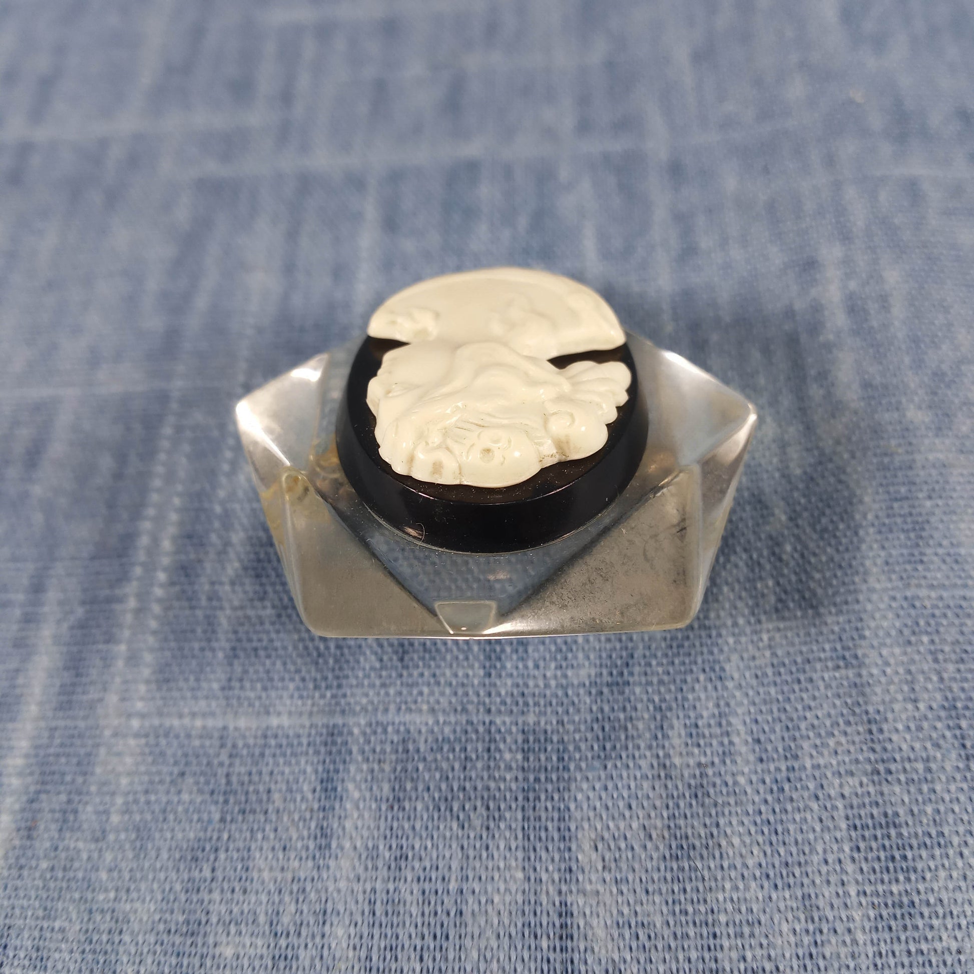 This exquisite 1950s vintage cameo pin features a refined white profile elegantly contrasted against a deep black background, all beautifully set within clear Lucite. Its classic design exudes timeless sophistication, making it a distinguished accessory that adds subtle elegance to any ensemble. A graceful nod to vintage artistry perfect for the discerning collector.