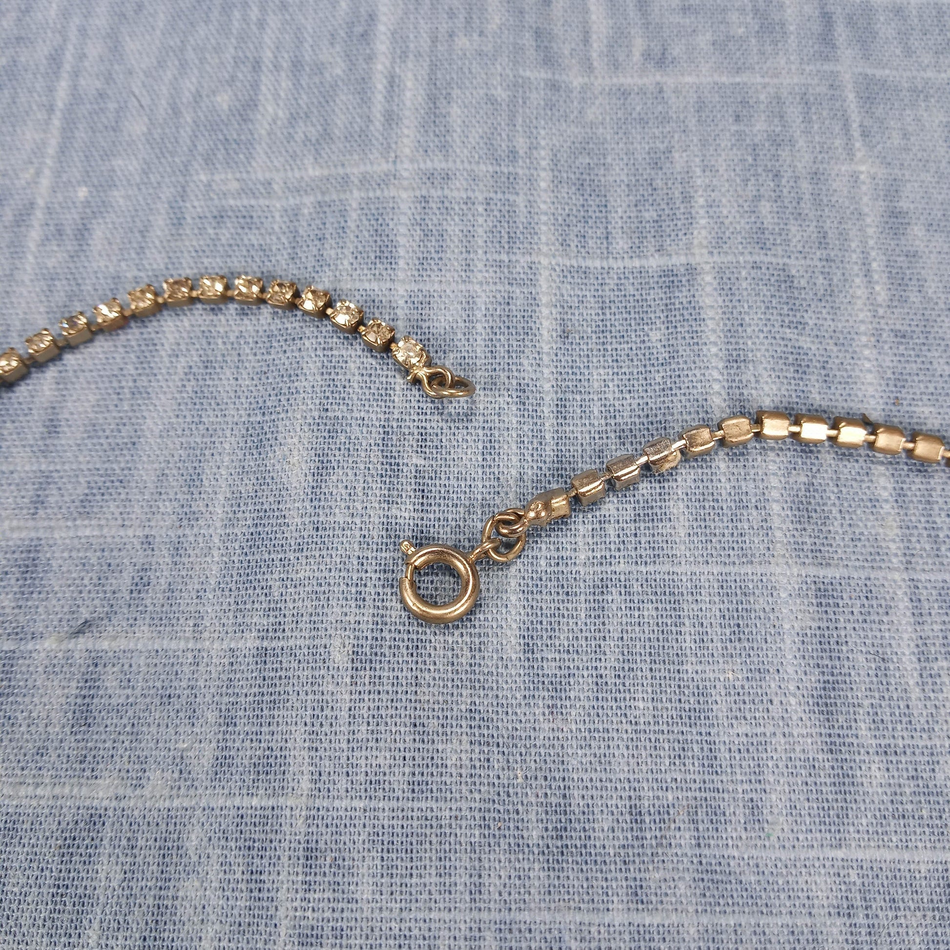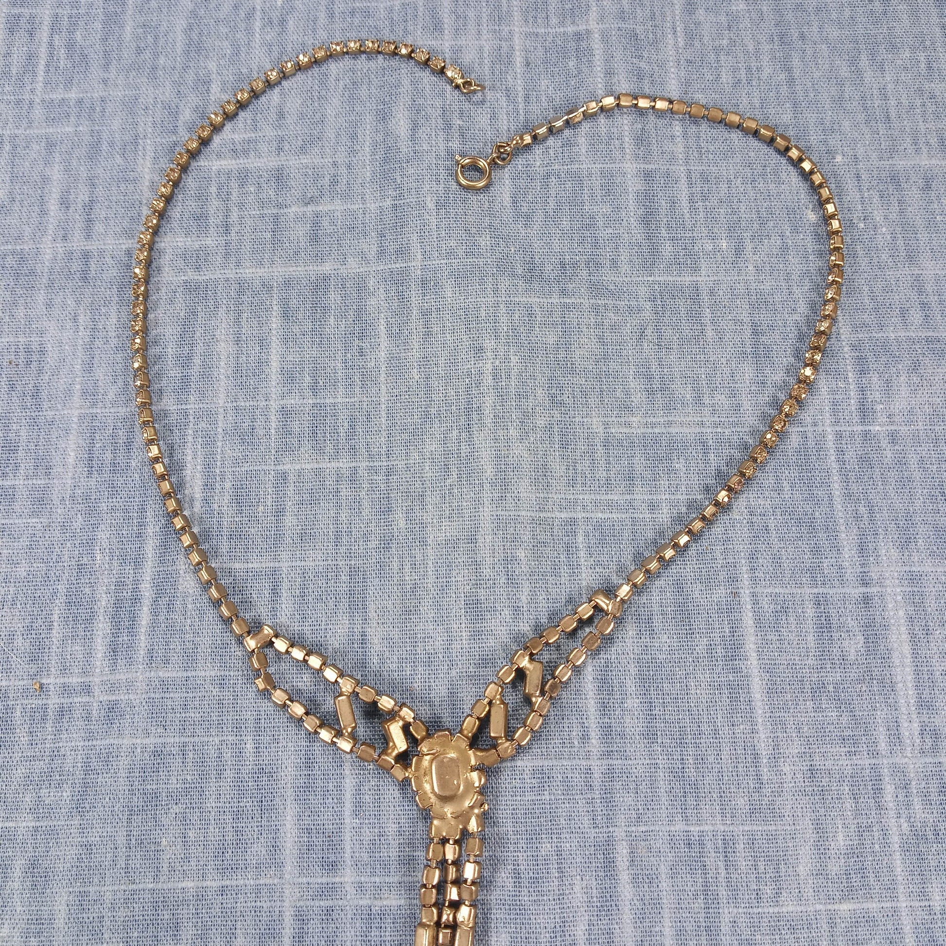 1950s Vintage Dangle Necklace with Clear Rhinestones and a Center Cut Pink Glass