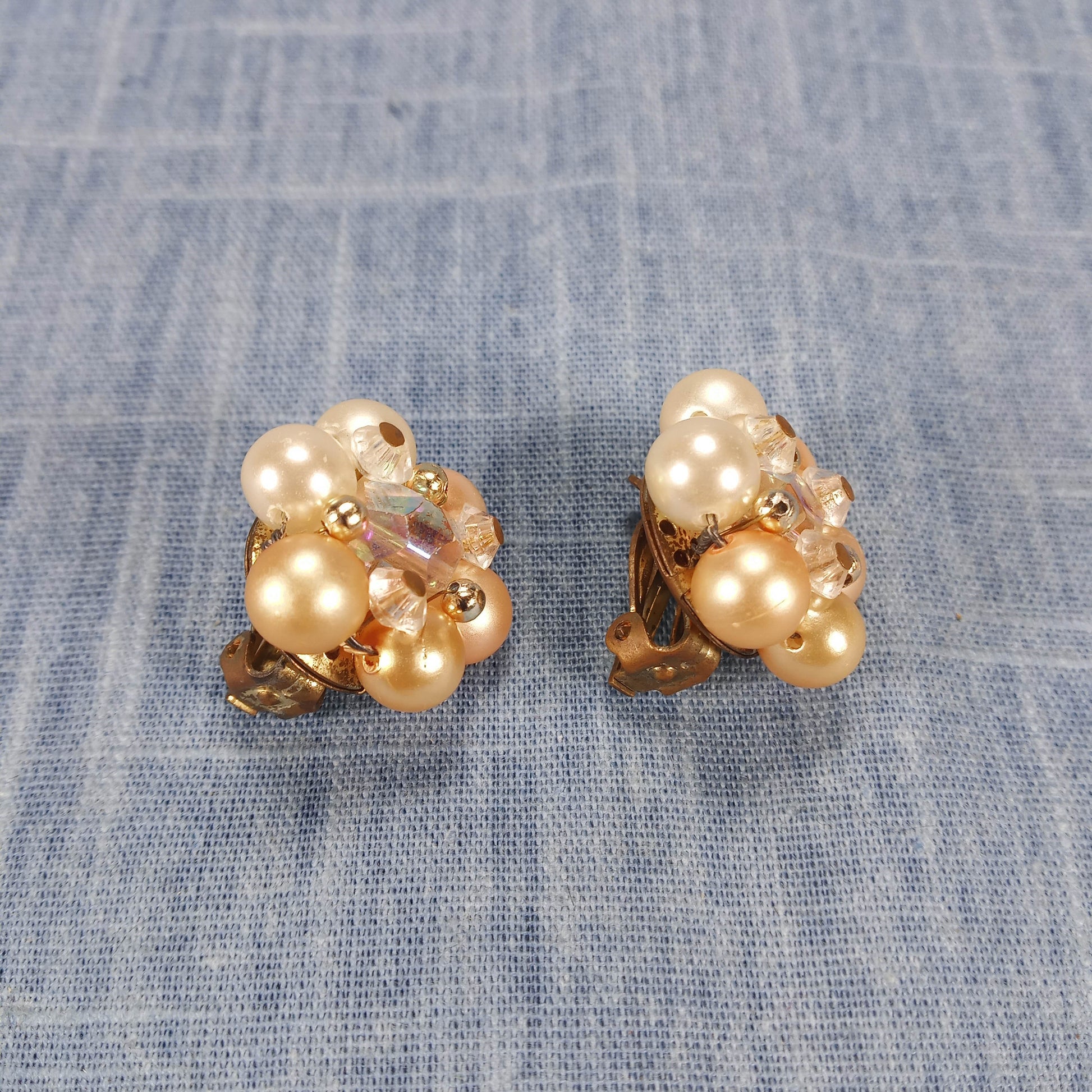 Add a touch of retro charm to your look with these delightful 1950s vintage clip earrings from Japan. Featuring lustrous pearl beads that playfully surround a sparkling center rhinestone, they bring a fun pop of elegance to any outfit. Perfect for those who love a little vintage sparkle with a cheeky twist!