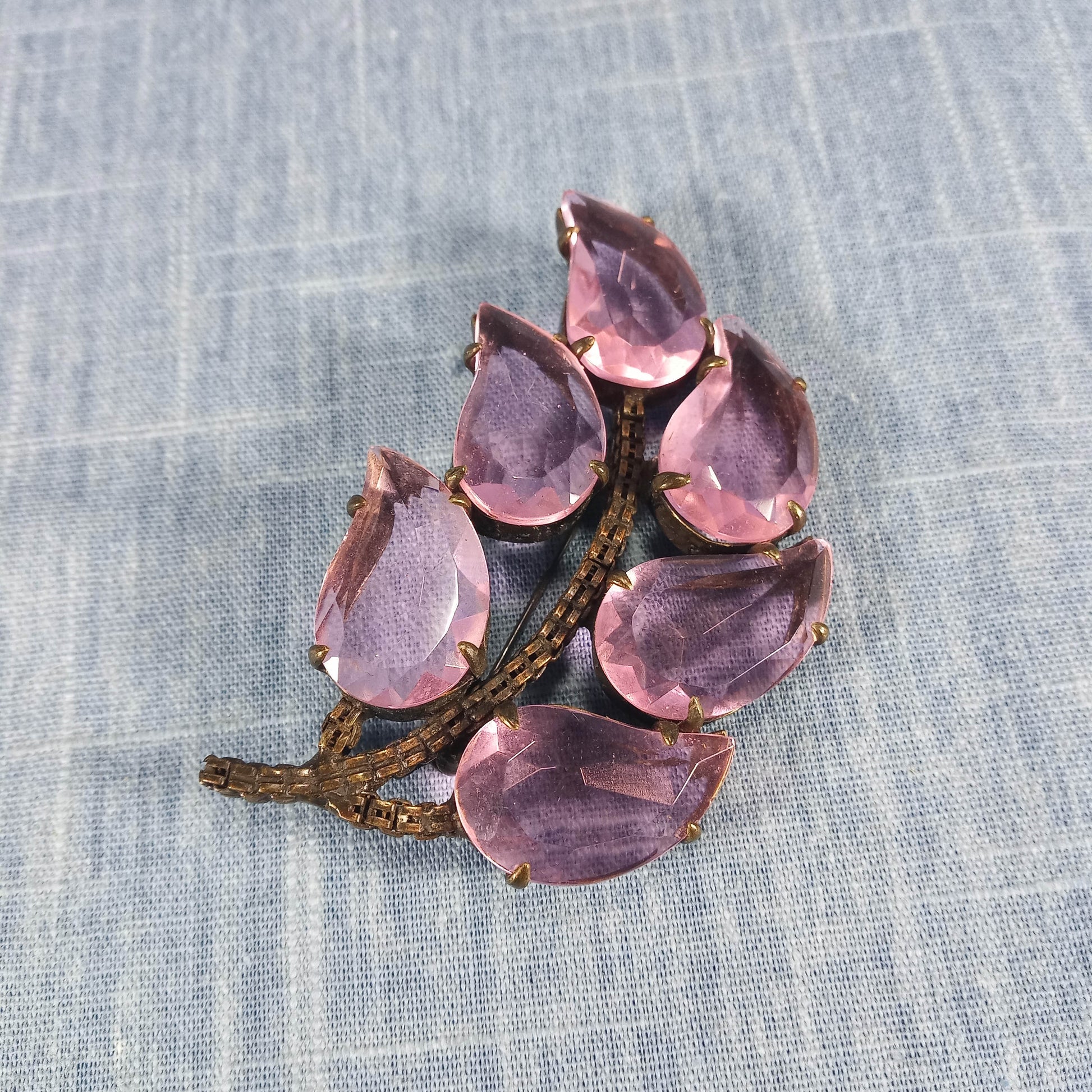 1950s Vintage Large Leaf Pin with Purple Czechoslovakian Glass