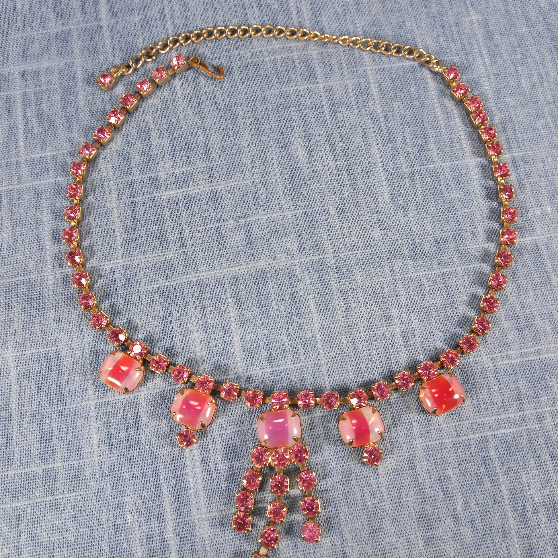 1950s Vintage Necklace: Pink Rhinestones and Glass with Dangle Center Piece