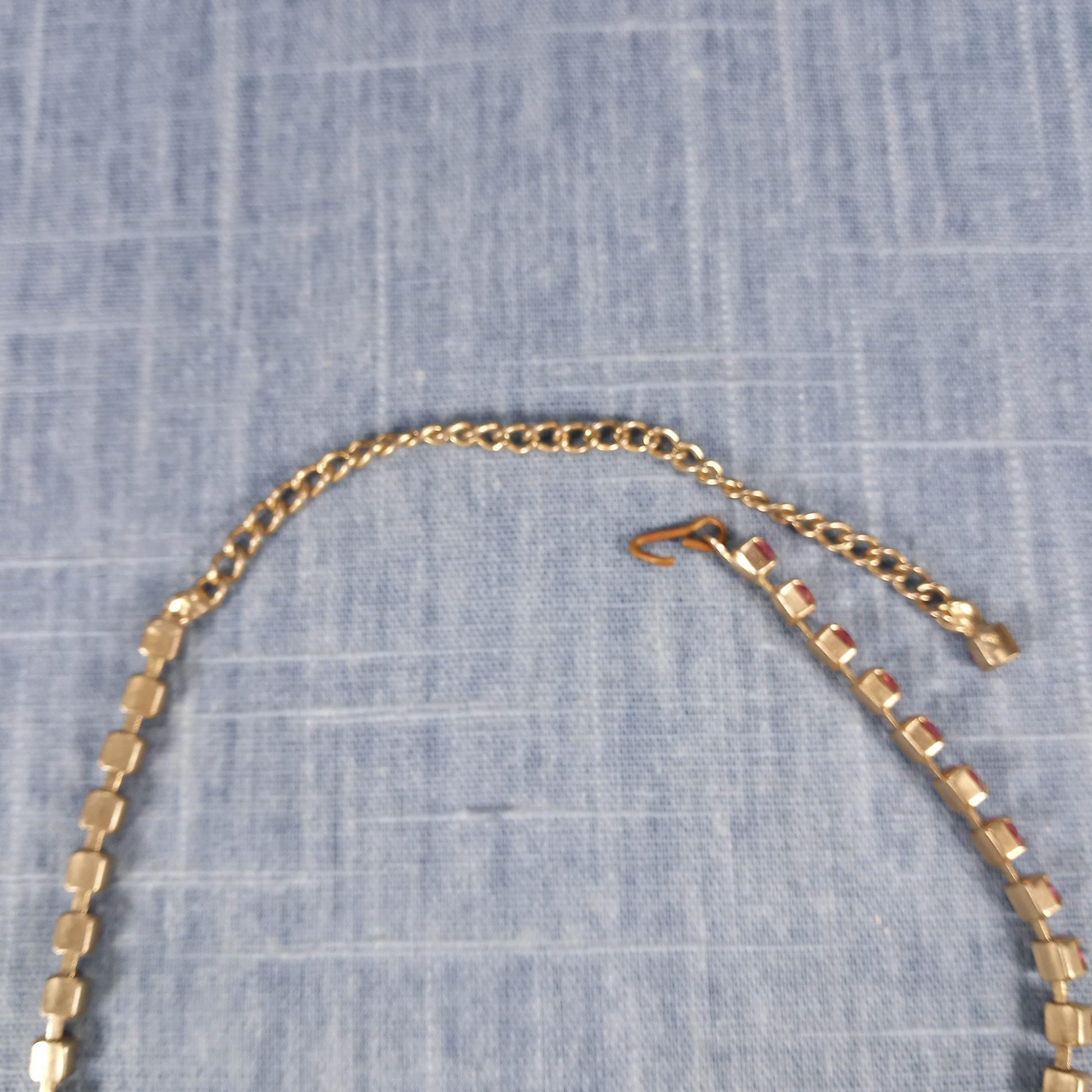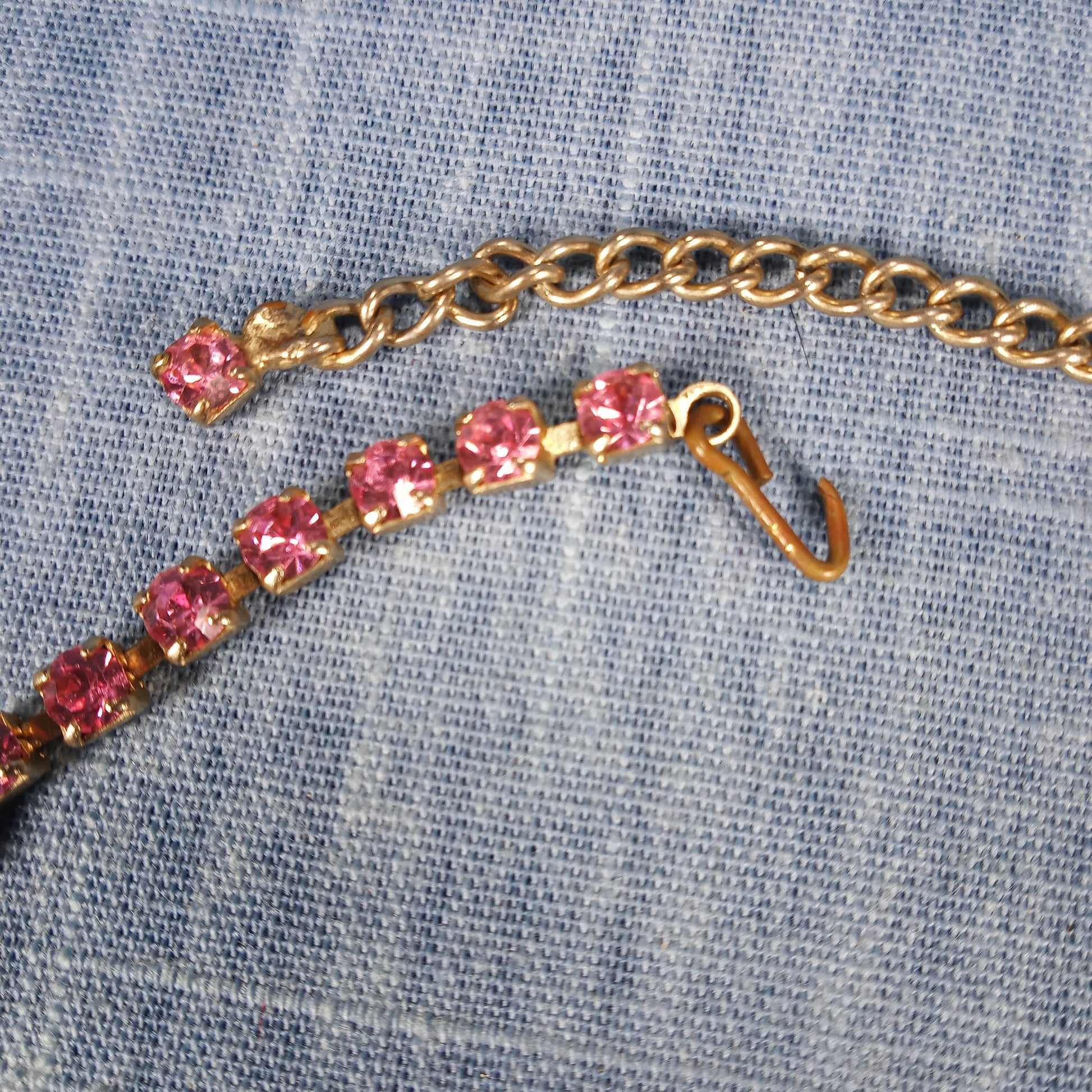 Elevate your elegance with this 1950s vintage necklace, featuring shimmering pink rhinestones and delicate glass elements. The centerpiece’s graceful dangle adds movement and charm, making it a refined accessory for special occasions or to enhance any sophisticated ensemble. This timeless piece captures the glamour of a bygone era with subtle sophistication.