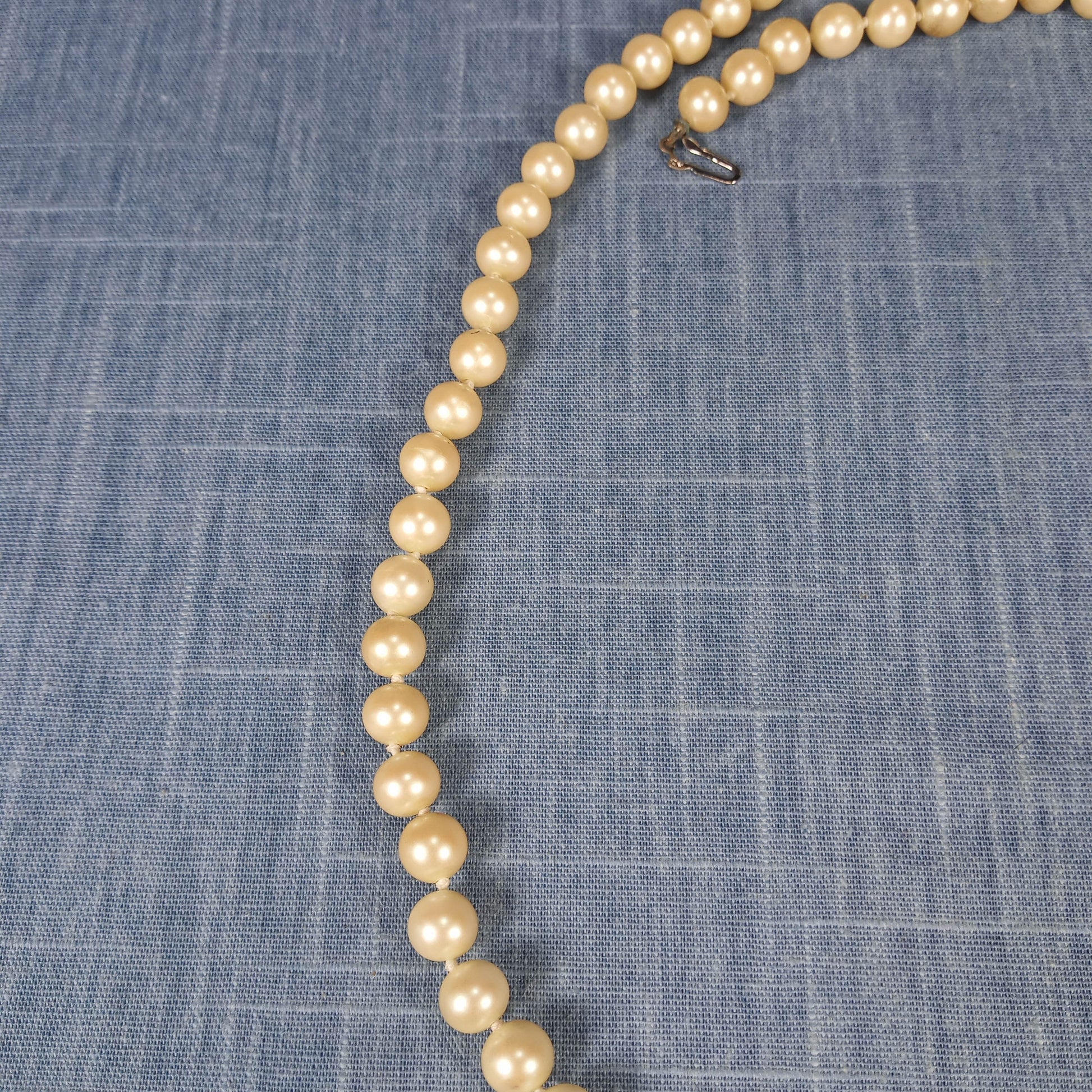 Drape yourself in timeless elegance with this charming 1950s pearl necklace! A single strand of lustrous pearl beads captures the sophisticated glamour of the golden age of Hollywood. Perfect for adding vintage flair to any outfit—whether you're channeling your inner Grace Kelly or just want to feel like a classic movie star. This delightful piece brings retro charm and understated luxury to your jewelry collection. A true keepsake from a bygone era!