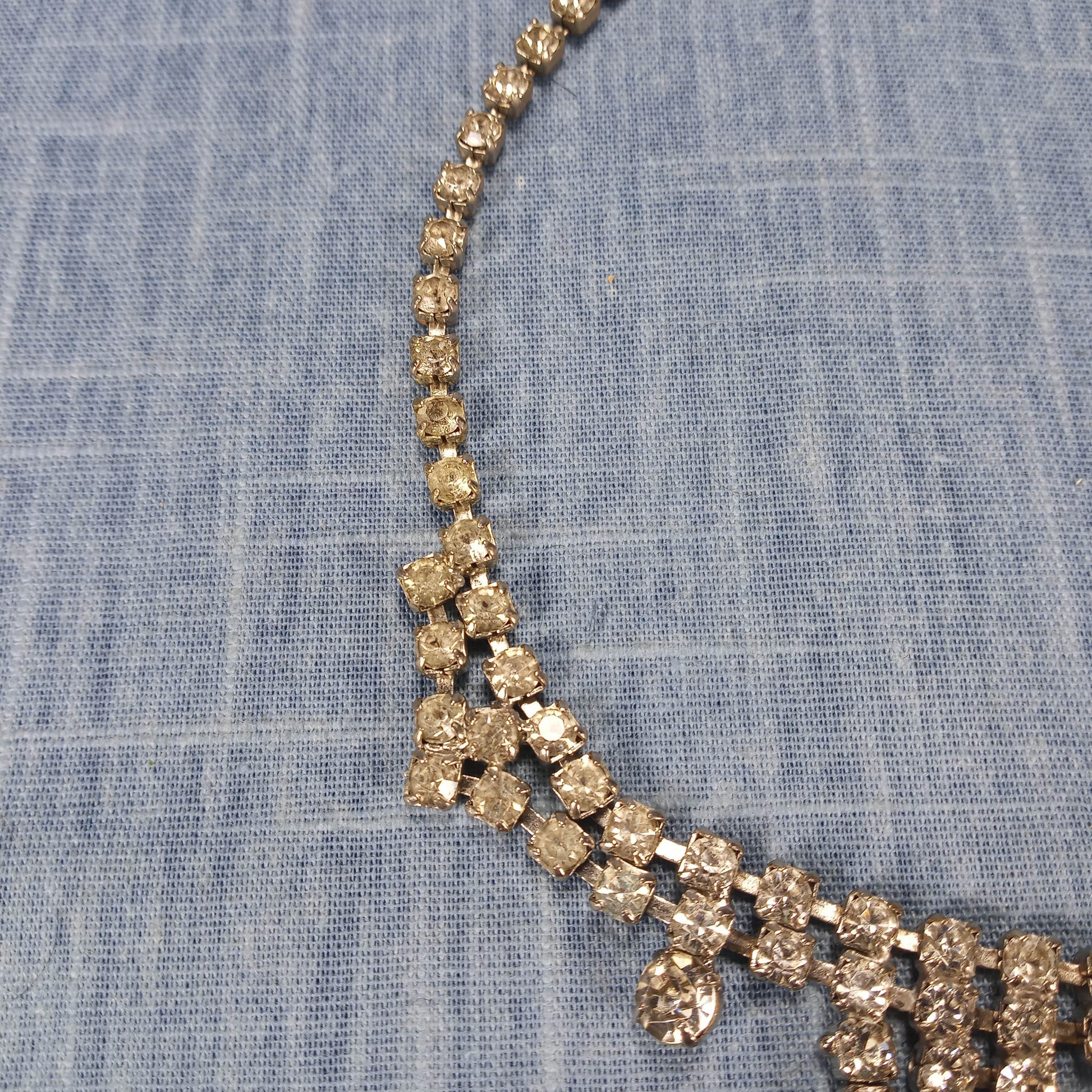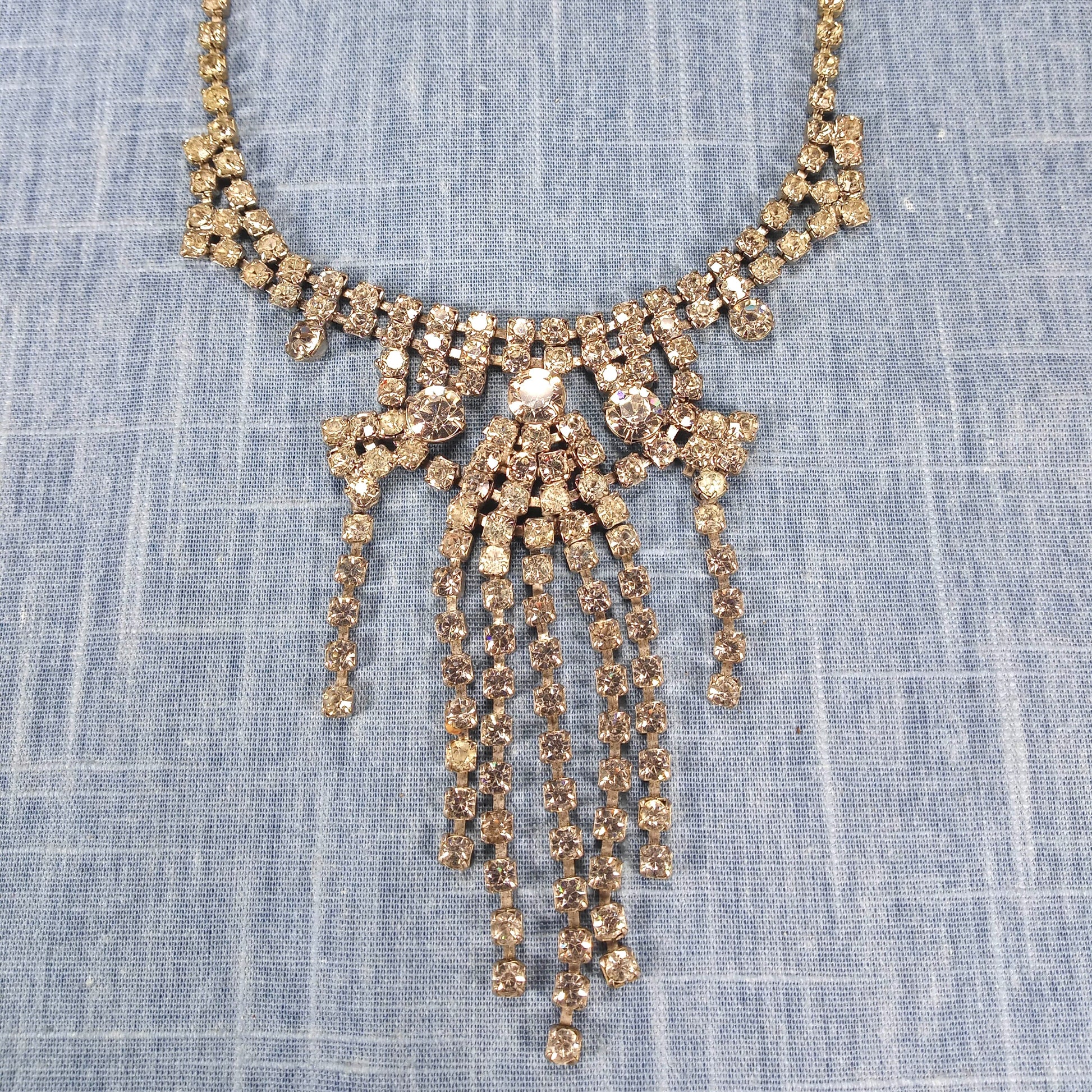 Elevate your ensemble with this exquisite 1950s vintage statement necklace, featuring elegant drop strands adorned with clear rhinestones. Its timeless design captures classic sophistication, making it an ideal accessory to add sparkle and refined charm to any occasion. Perfect for those who appreciate vintage glamour and enduring style.