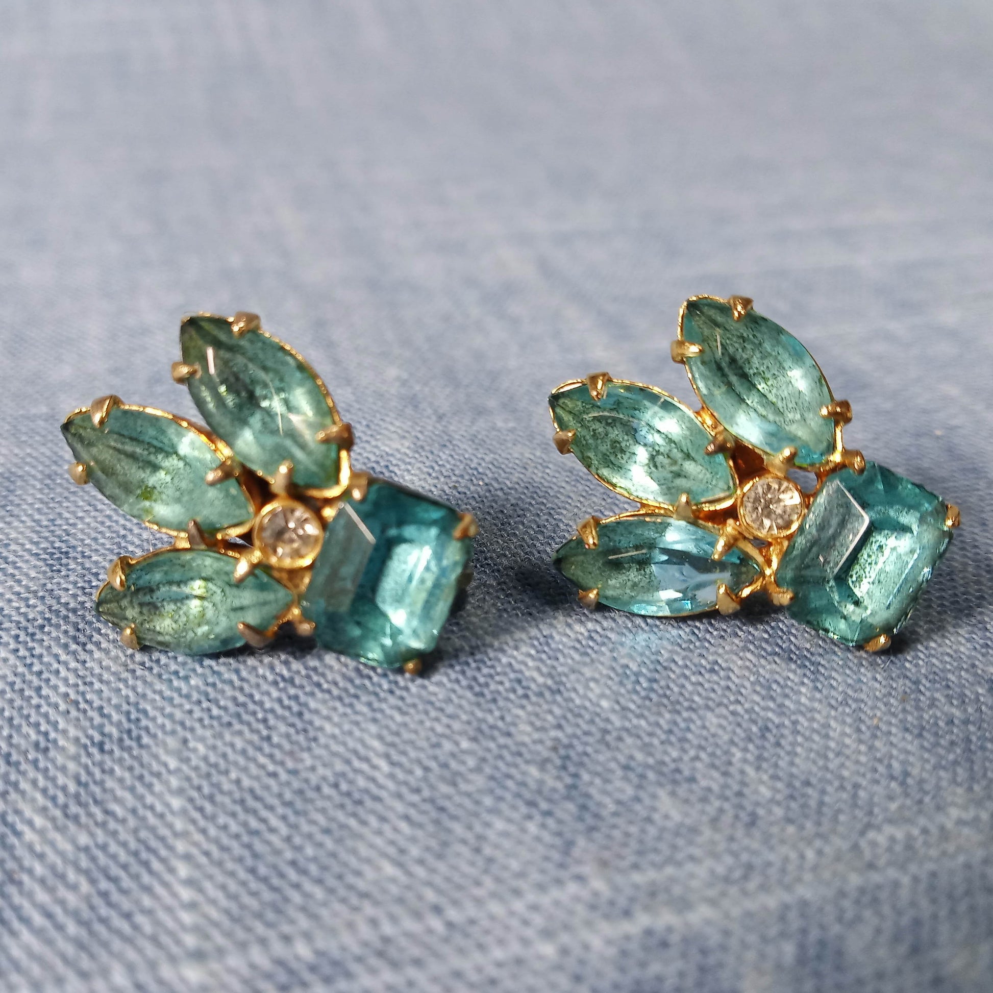 1960s Vintage Clip Earrings with Aqua Blue Rhinestones
