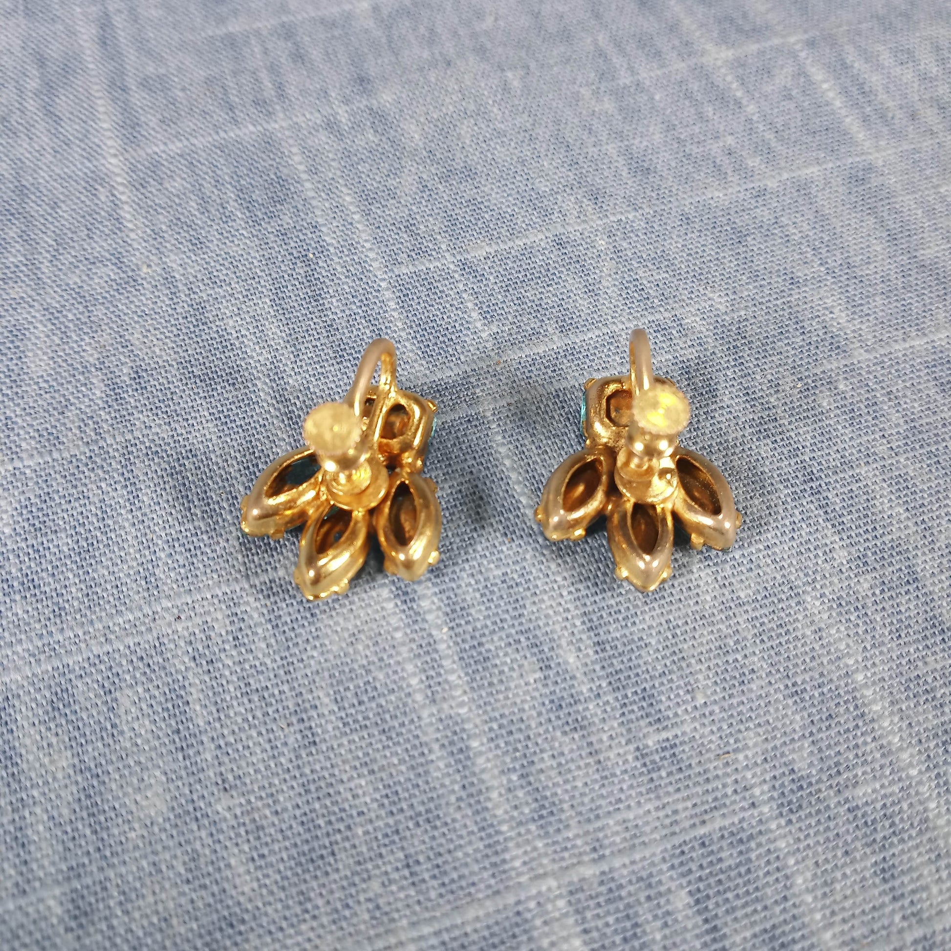 Step back in time with these dazzling 1960s clip earrings, where retro glamour meets sparkle! Featuring brilliant aqua blue rhinestones that catch the light with every turn of your head, these beauties deliver that perfect pop of color vintage lovers crave. The classic clip-on style means no piercing required—just clip, shine, and go. Whether you're channeling your inner mod icon or adding a fun twist to everyday wear, these gems are ready to make a statement. A timeless treasure from the groovy decade!
