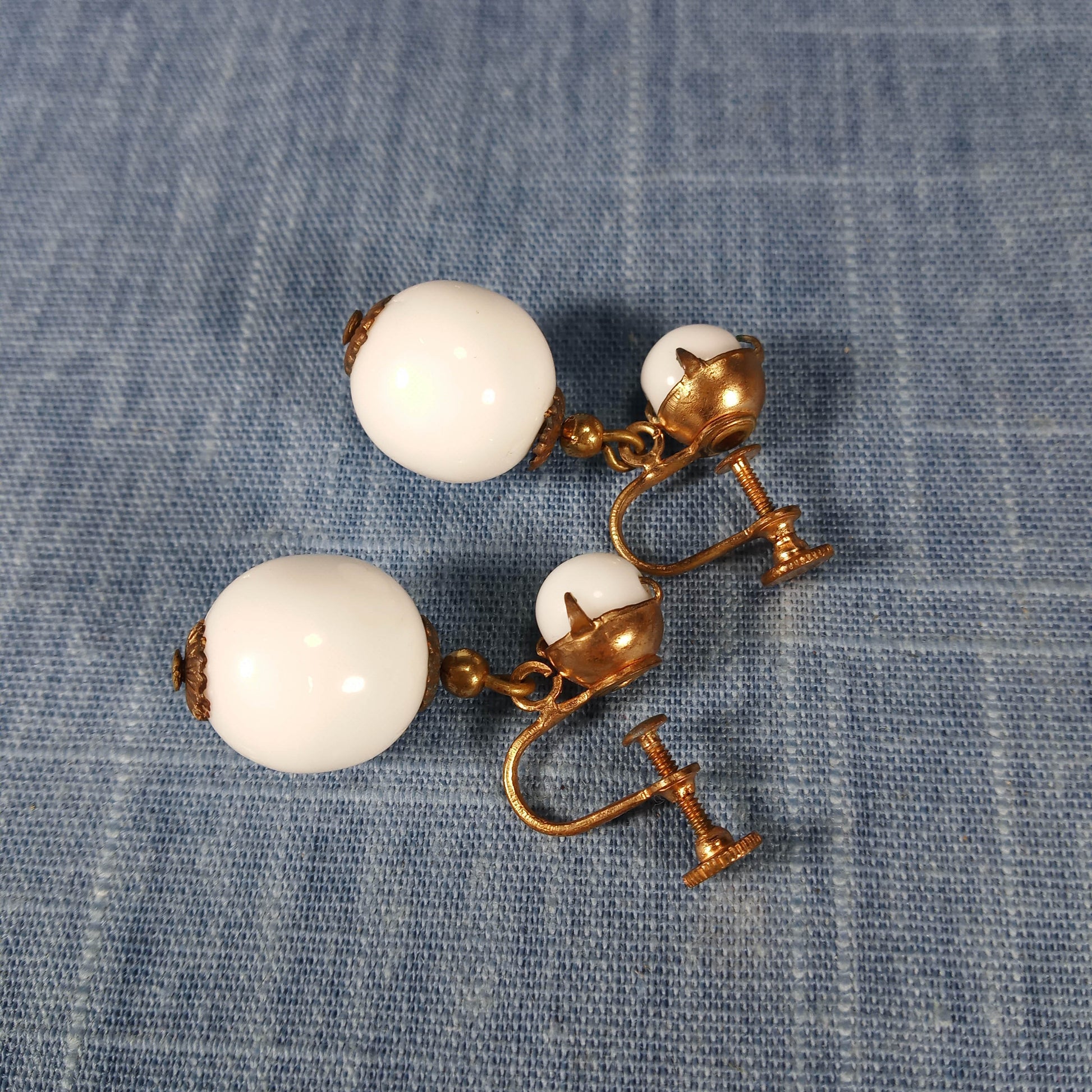 1960s Vintage Dangle Screw Back Earrings with Large and Small White Beads