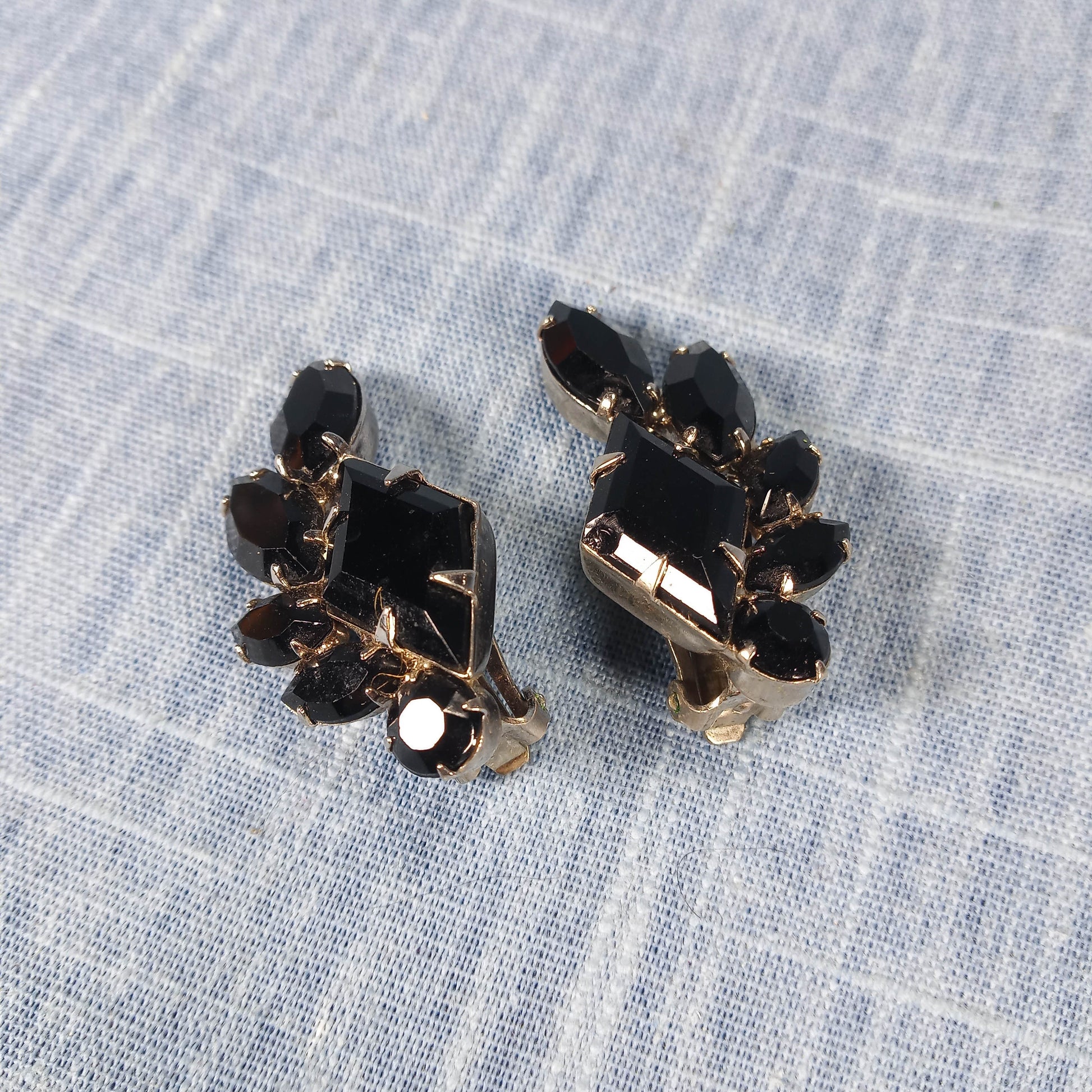 This elegant 1960s vintage jewelry set features a matching brooch and clip earrings adorned with striking black open back rhinestones. Perfectly capturing mid-century glamour, the set adds a timeless touch of sophistication to any ensemble. Its classic design ensures versatility for both formal occasions and stylish everyday wear.