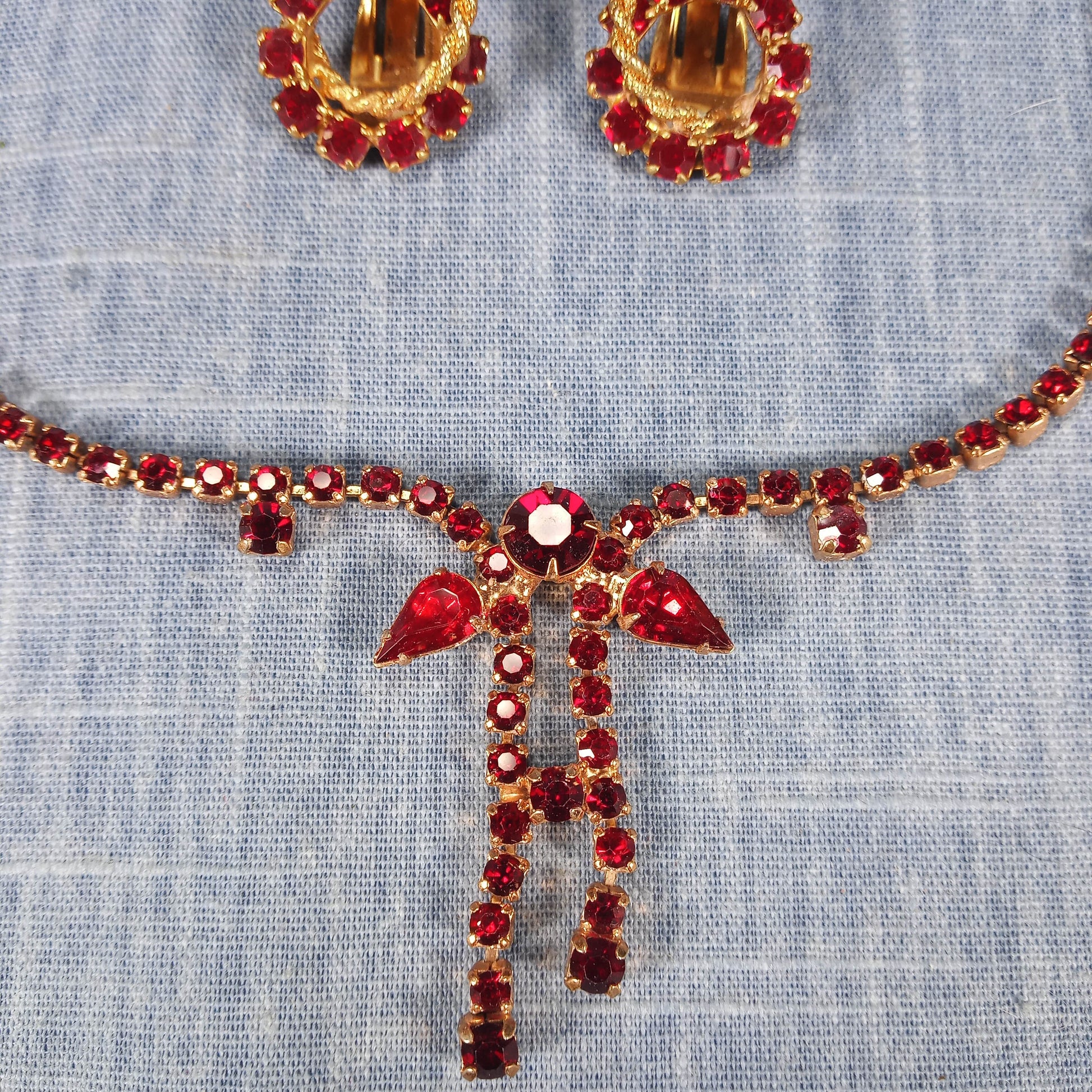 1960s Vintage Jewelry Set: Matching Clip Earrings and Drop Necklace with Red Rhinestones