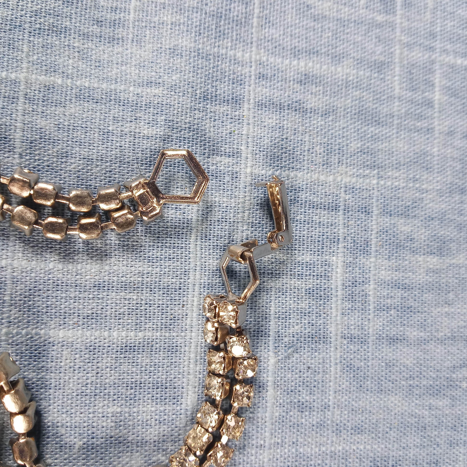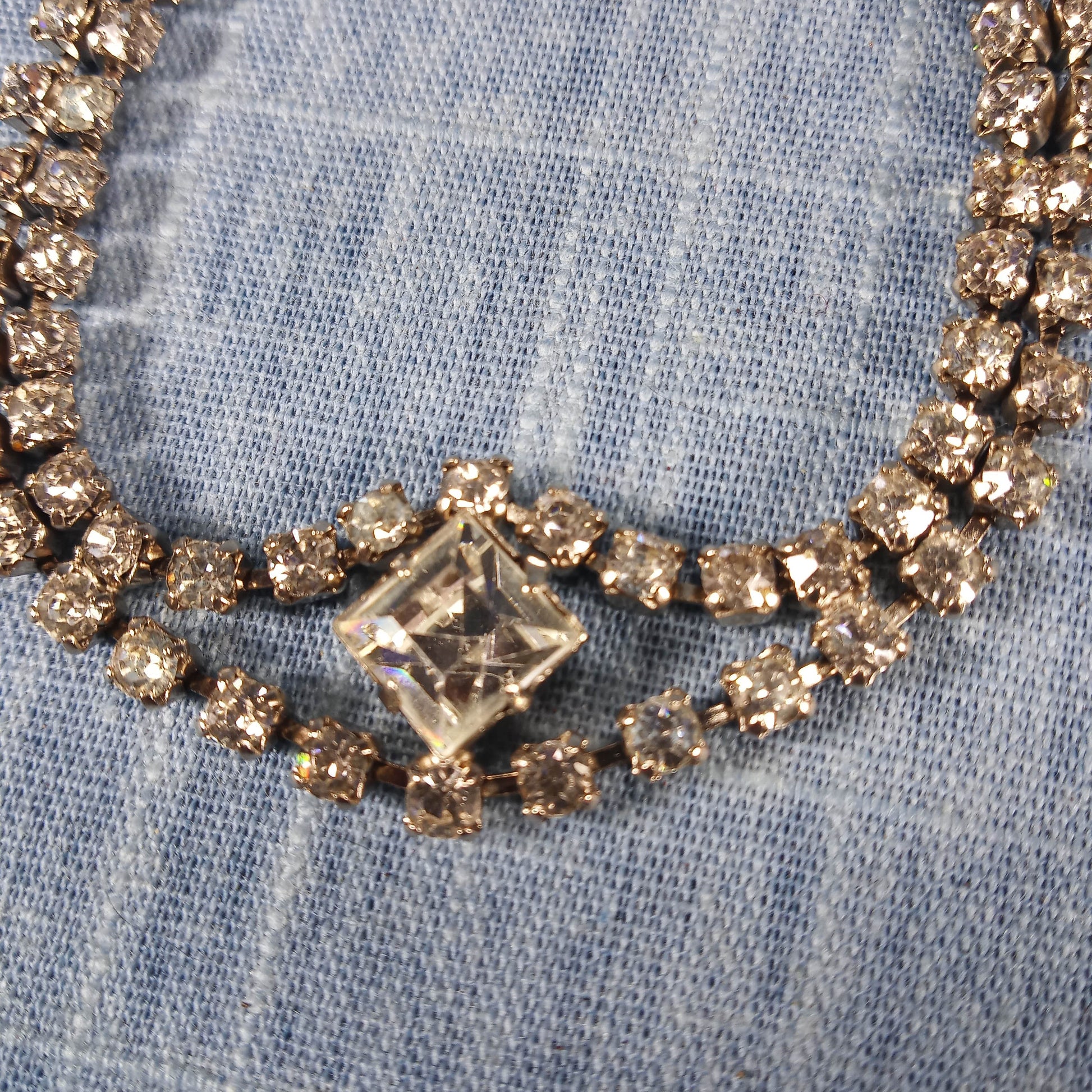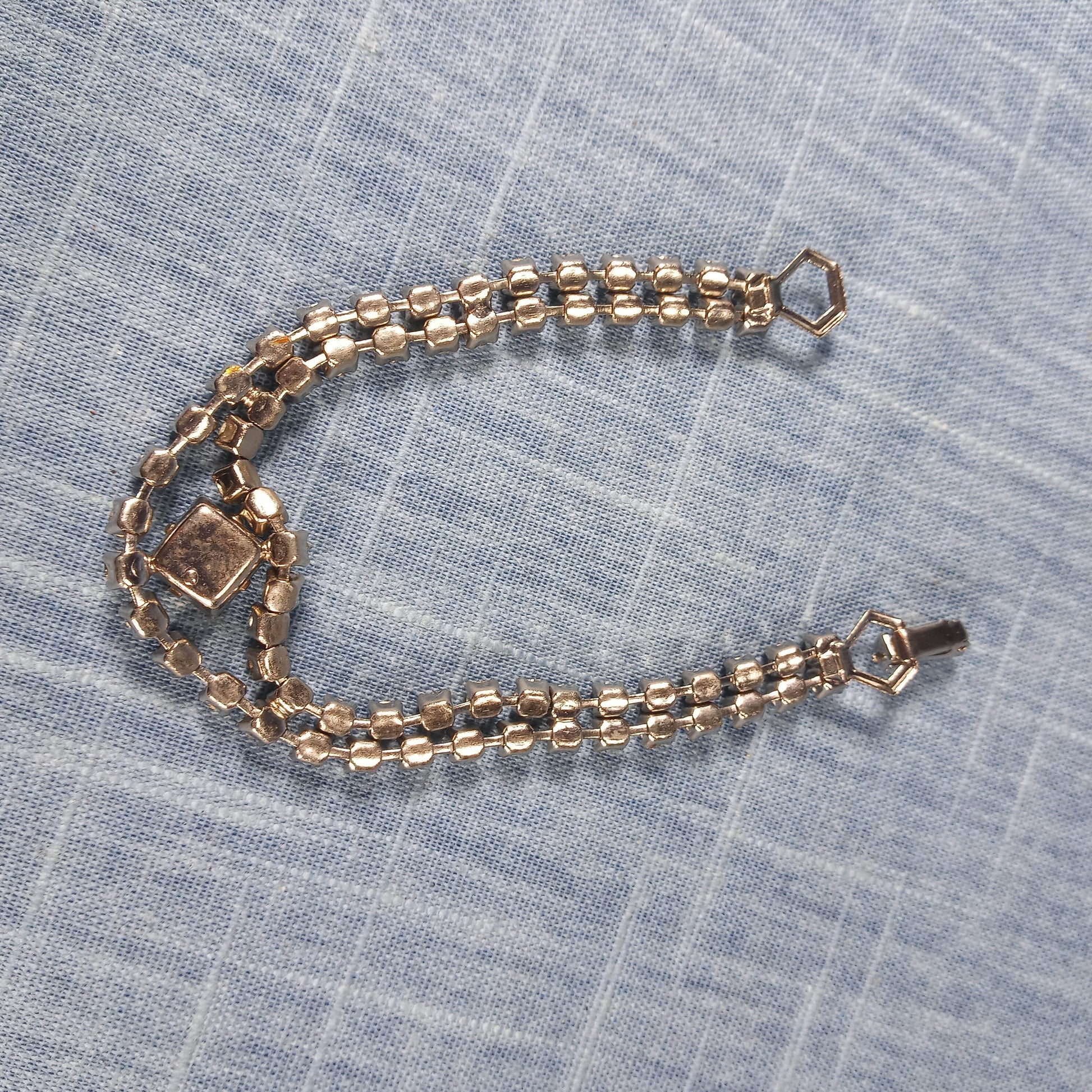 Add a sparkling touch of retro charm with this 1970s vintage bracelet! Featuring a dazzling center rhinestone flanked by double rows of clear rhinestones, this playful piece catches the light with every move. Perfect for adding a bit of disco-era sparkle to your look, it effortlessly blends vintage glam with fun flair.
