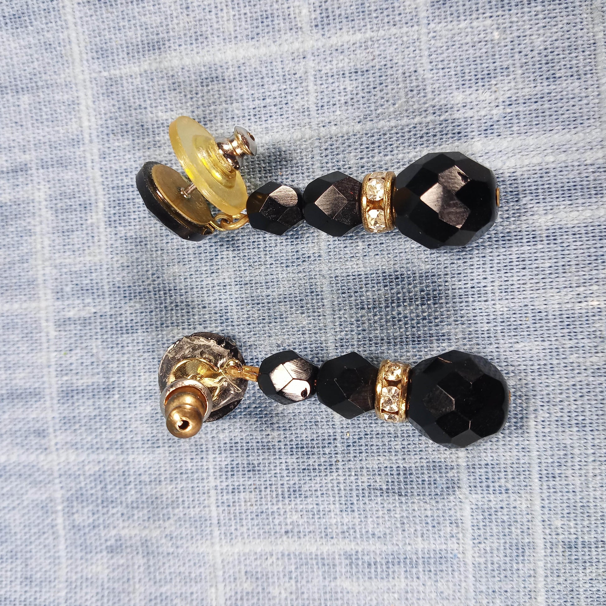 1970s Vintage Dangle Earrings with Black Beads and Clear Rhinestones