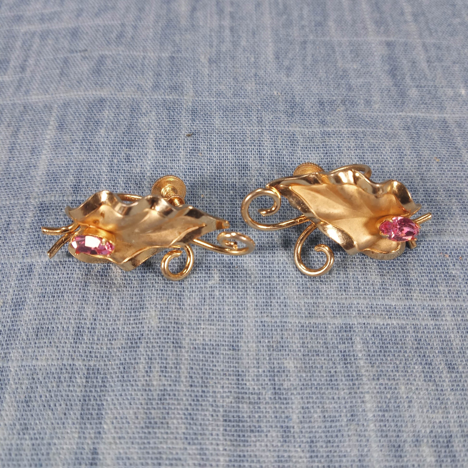 1970s Vintage Screw Back Earrings with a Gold Tone Leaf and a Pink Rhinestone