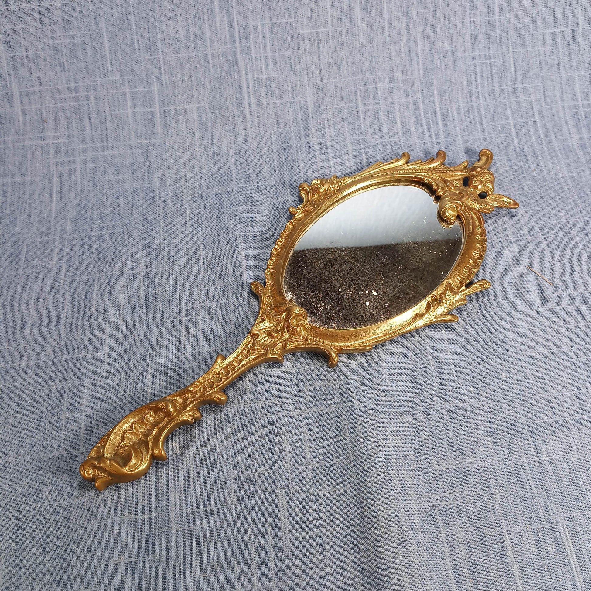 This charming hand mirror captures the elegance of a bygone era with its ornate gold-tone cast metal frame. Perfect for vintage enthusiasts and collectors, the screw-on back design makes it easy to display or gift. Whether you're adding a touch of nostalgic glamour to your vanity or hunting for that perfect period piece, this early 20th century treasure brings timeless sophistication to any space. A delightful conversation starter with genuine vintage character!